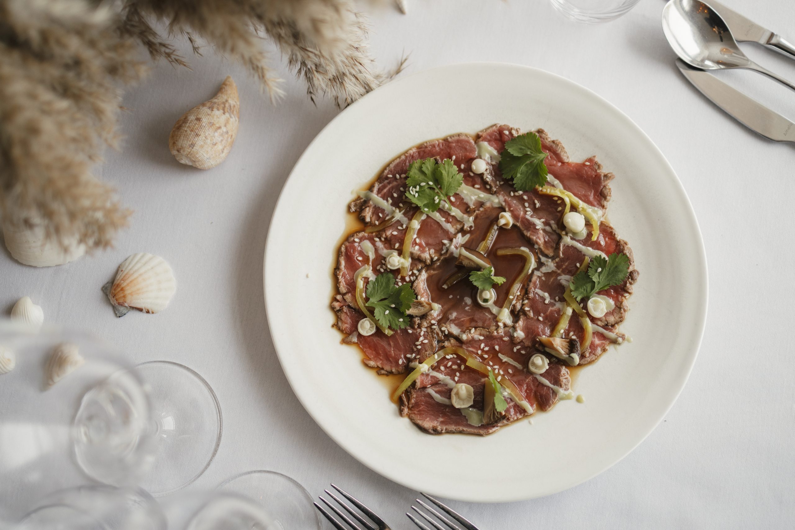 Tataki z polędwicy wołowej z ponzu, majonezem wasabi, kolendrą, oshinko, grzybami shimeji i shiitake 120 g / 99 zł