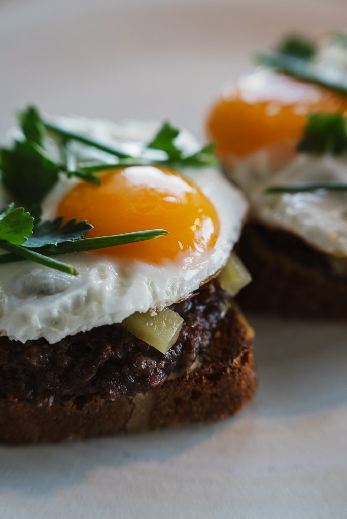 Grzanka z chleba żytniego ze smażoną kaszanką z porem, musztardą, kiszonym ogórkiem i jajkiem sadzonym 400 g / 34 zł