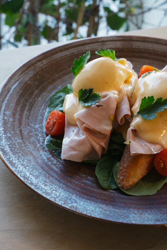 Jajka po benedyktyńsku z włoską mortadela, świeżym szpinakiem i pomidorami koktajlowymi 320 g / 38 zł