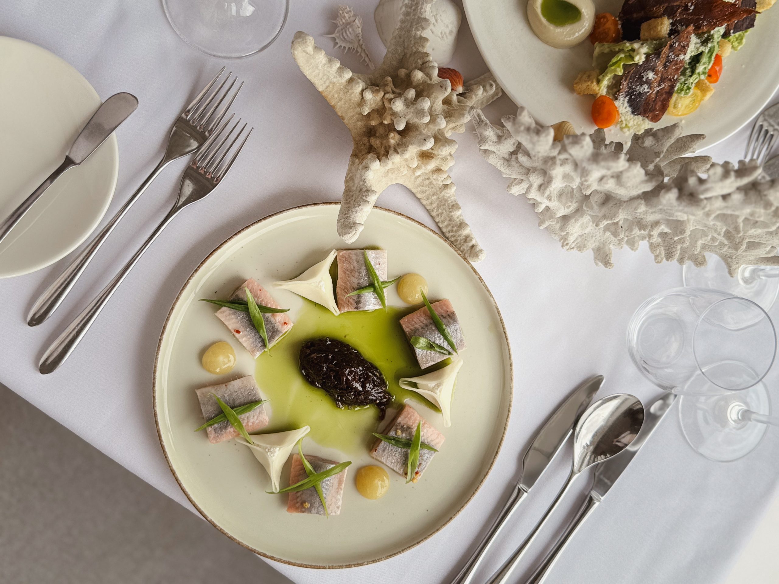Różowy śledź holenderski marynowany w chili z konfiturą z czerwonej cebuli, kalarepą z wędzonym twarogiem, yuzu i dymką (120 g) 79 zł