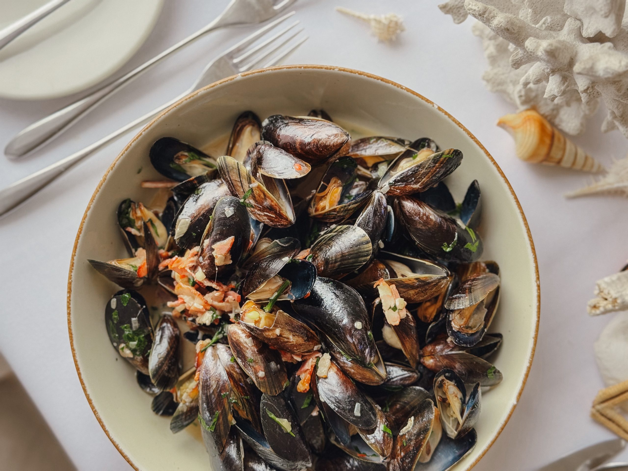 Mule w emulsji z białego wina, wędzonym boczkiem, szalotką, chili, czosnkiem i zieloną pietruszką (700 g) 96 zł